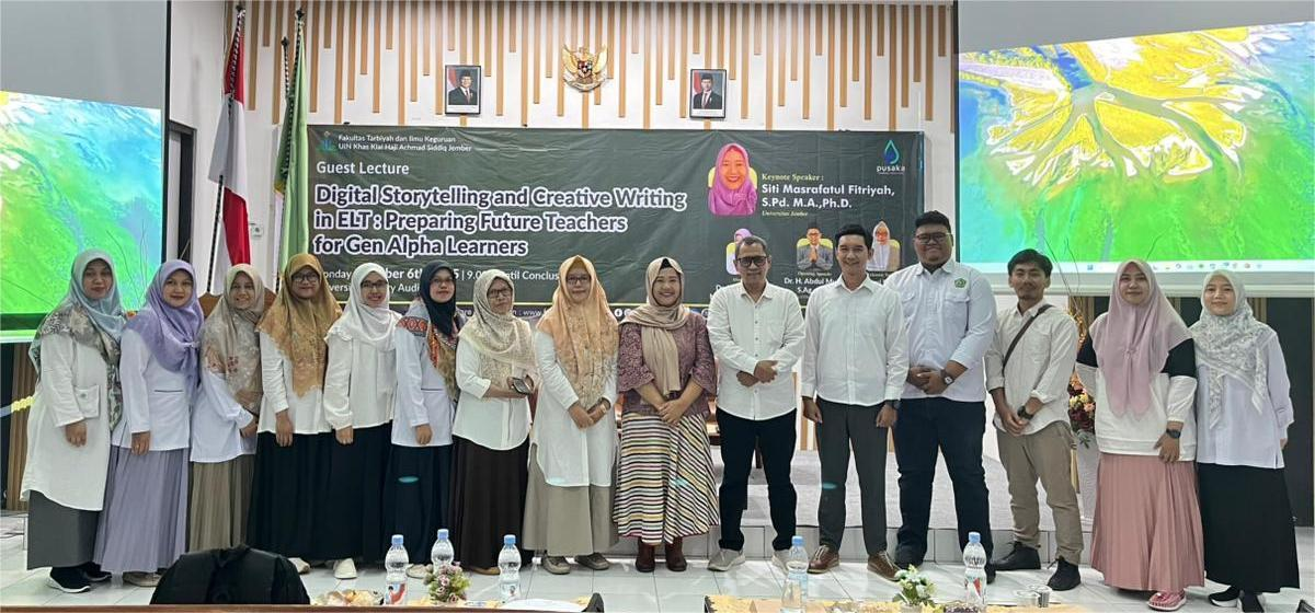 Jember – Program Studi Pendidikan Bahasa Inggris, Fakultas Tarbiyah dan Ilmu Keguruan (FTIK) UIN Kiai Haji Achmad Siddiq (KHAS) Jember, terus berinovasi dalam menyiapkan calon pendidik yang tangguh menghadapi era digital. Hal ini tampak dalam penyelenggaraan kuliah tamu bertajuk “Digital Storytelling and Creative Writing in ELT: Preparing Future Teachers for Gen Alpha Learners”, yang digelar pada Senin, 6 Oktober 2025, di Auditorium Perpustakaan Universitas.